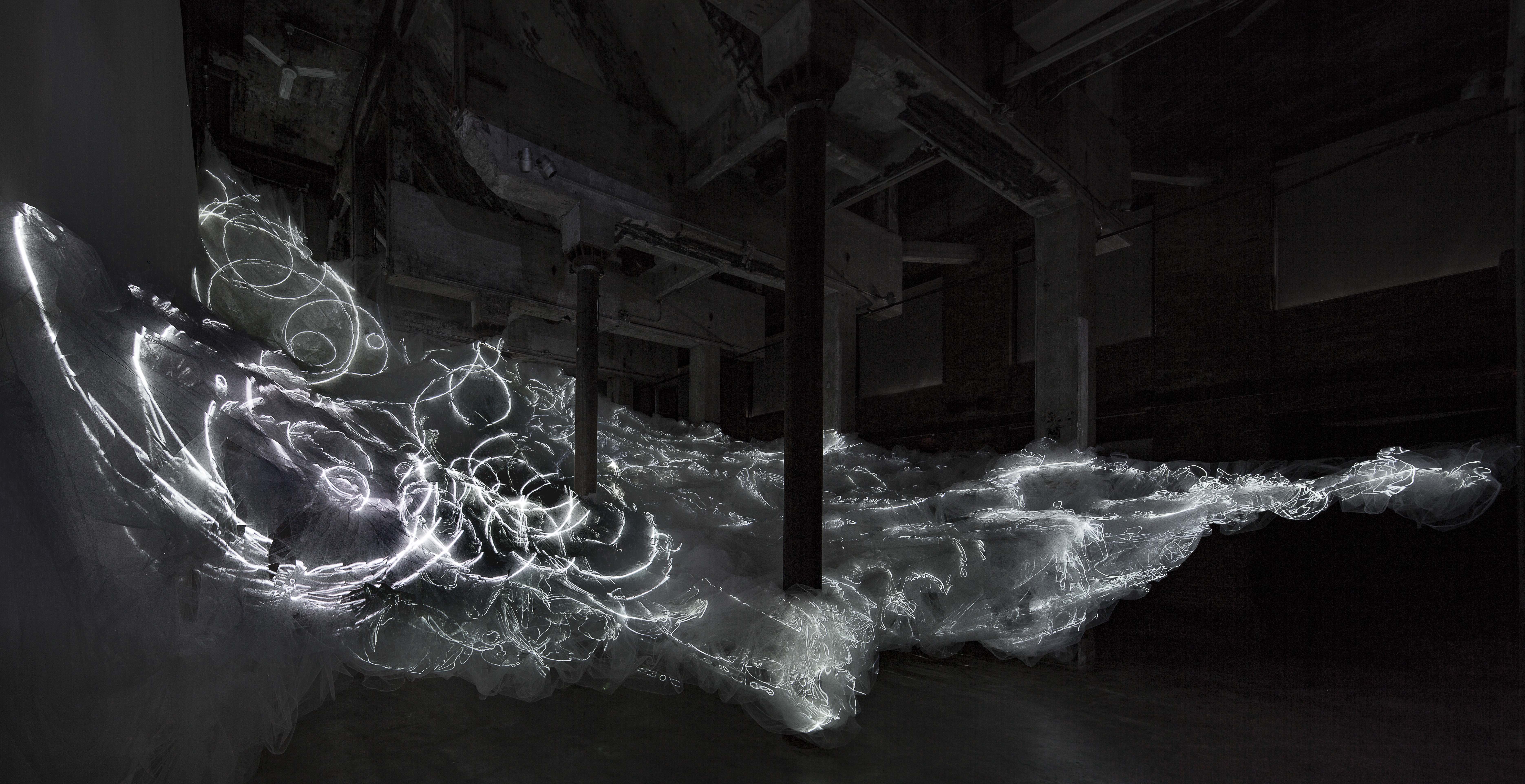 ROIL at Smack Mellon 09 January- 21 February 2016: site-specific work,ROIL, creates an immersive and ephemeral experience drawing on the gallery’s unique history as one of "Gairville's" energy churning boiler buildings in DUMBO. 8 Channel video onto fabric installation, 35'Hx55'Lx28'W. smackmellon.org, click here for flickr image gallery. ROIL was awarded a 2016 Lumen CItation award by the NYC chapter of the Illuminating Engineering Society and a Lighting Design Award for Light Art Project of the Year and was published in Issuu Mondo Arc's spotlight section in the April/May issue.